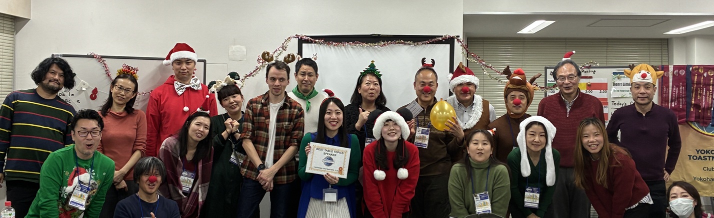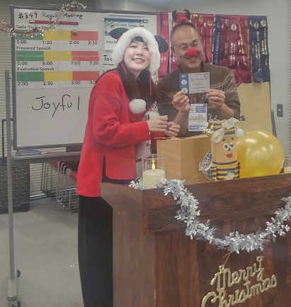 今年最後のミーティグは「喜びと温もりのひととき」をテーマに、クリスマスを中心に開催されました。20年前に入会した元メンバーはオンラインで参加し、3回目のゲストは来場しました。開始前から会場を飾り付け、メンバーや役割担当者は赤や緑のセーターにトナカイのカチューシャやサンタ帽子、赤いトナカイの鼻を身につけ、なかには馬のボディスーツにトナカイ帽子のメンバーもいて^.^、笑顔あふれる明るく温かな雰囲気の中、例会が始まりました。