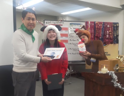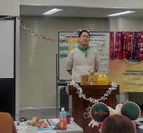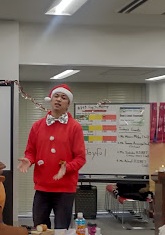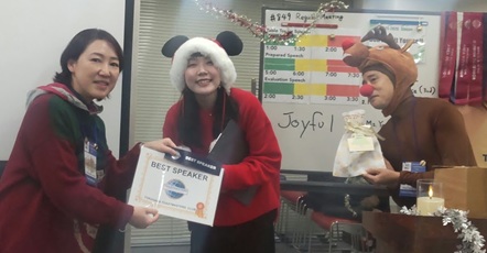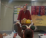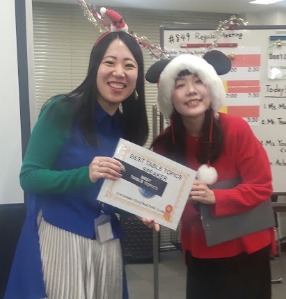 次は本日の司会、Toastmaster of the DayのTM Oの登場です。サンタの帽子に鮮やかな赤いセーターを身につけた、明るく元気な司会者が例会の進行を担当しました。
